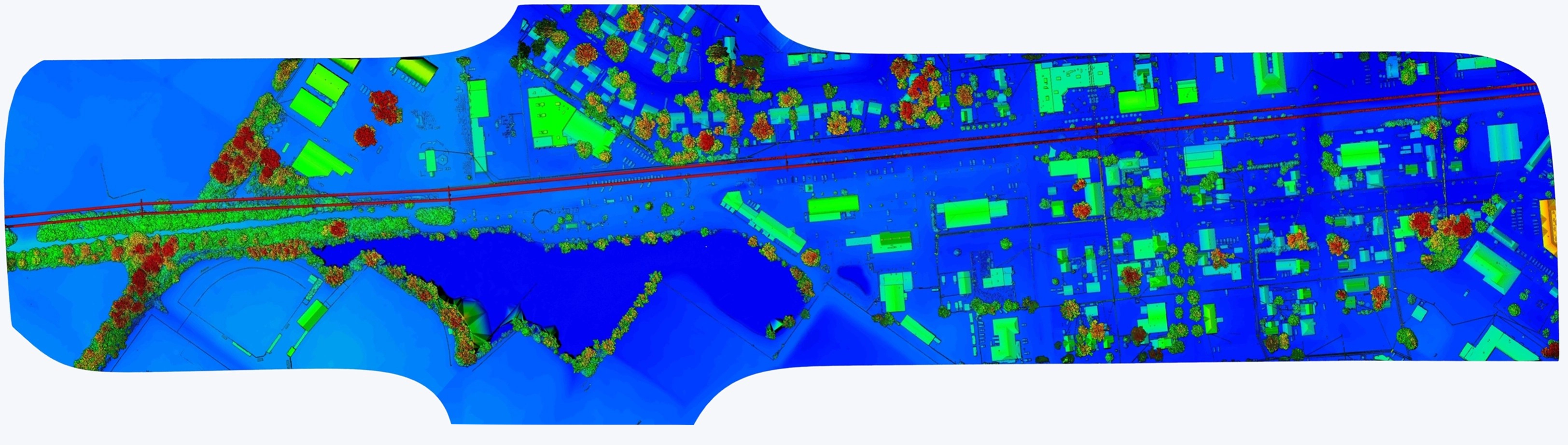 This is a large-format, long, linear corridor dataset captured as a combined LiDAR + RGB survey. It is designed to test PixElement on corridor-length geometry relevant to utility operations (continuous conductors, repeated structures, vegetation encroachment, and clearance-critical spans) rather than a small, isolated site map.